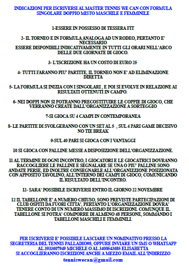 Il master di Tennis We Can di fine anno sarà motivo di grande orgoglio per tutti noi. Torneremo infatti a giocare in un Tennis Club della nostra città che ha fatto la storia degli ultimi anni, con l’organizzazione del più importante torneo della nostra regione Veneto, un Challenger ATP da 75000 $, che è l’orgoglio di tutti noi Vicentini.